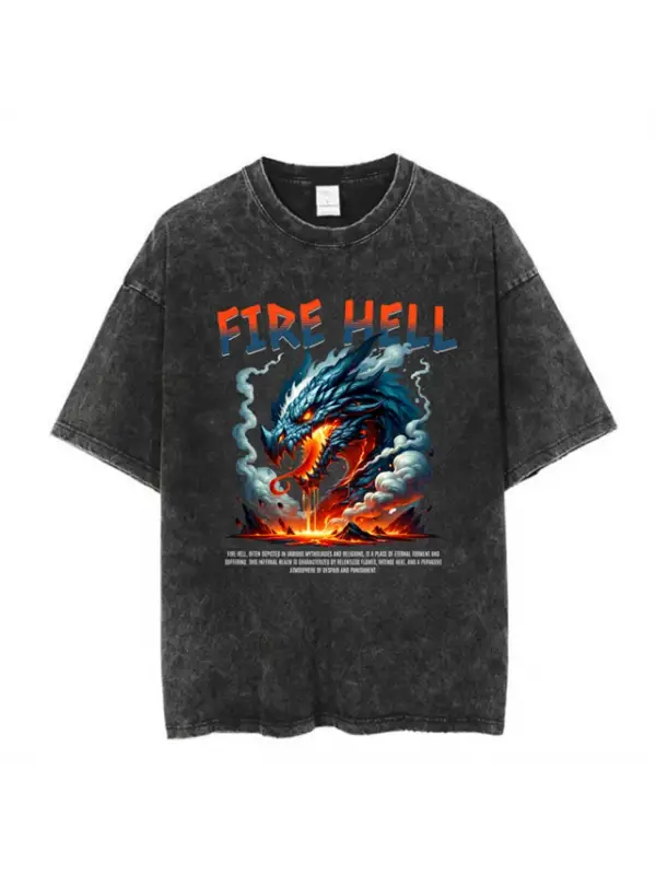 Yıkamalı Fire Hell Baskılı Unisex Oversize Vintage T-Shirt