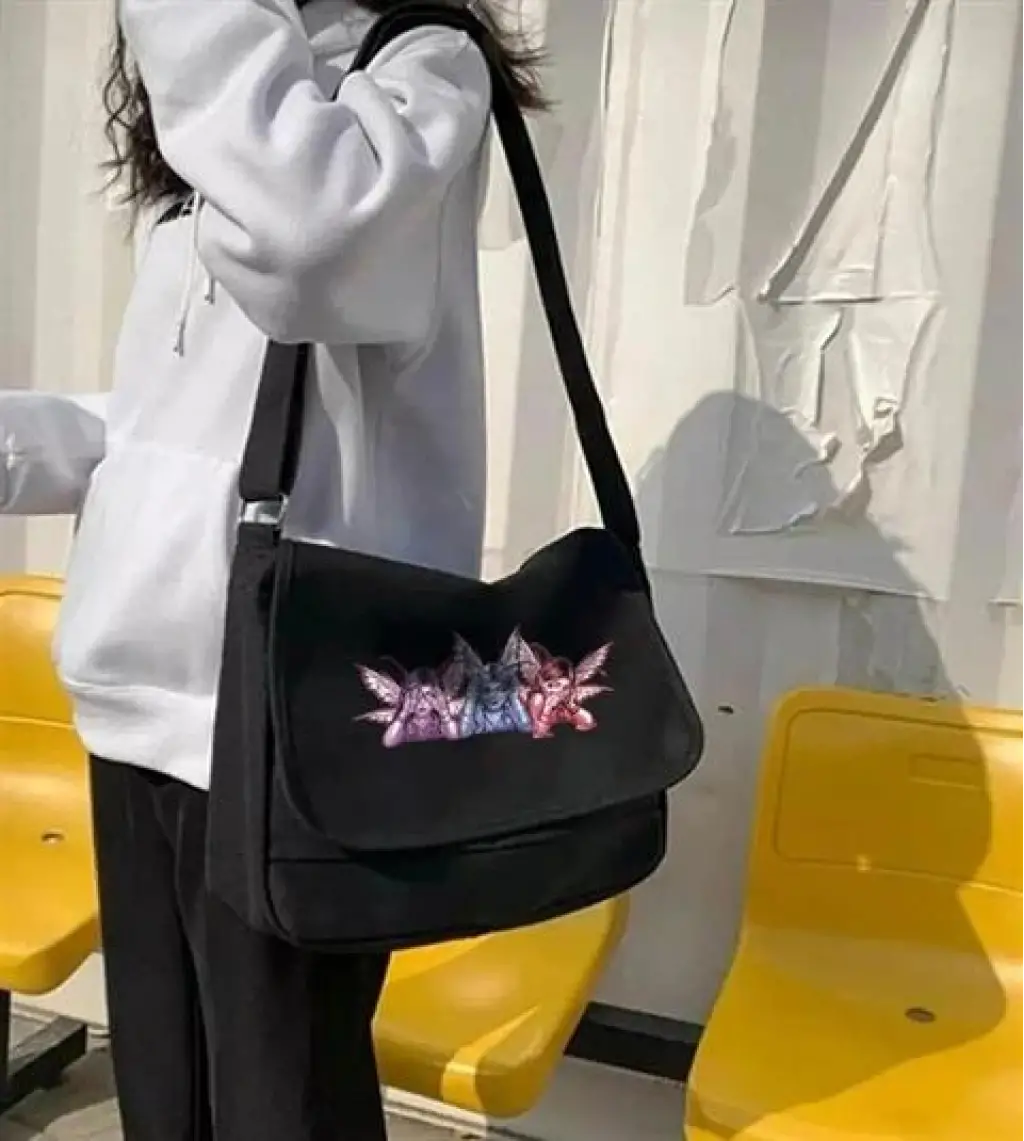 Winged Girls Baskılı Unisex Siyah Postacı Çantası