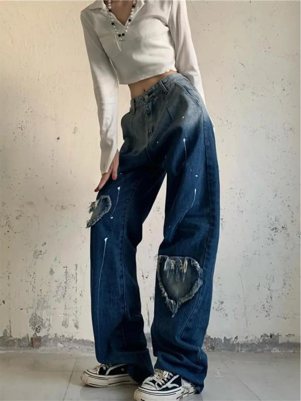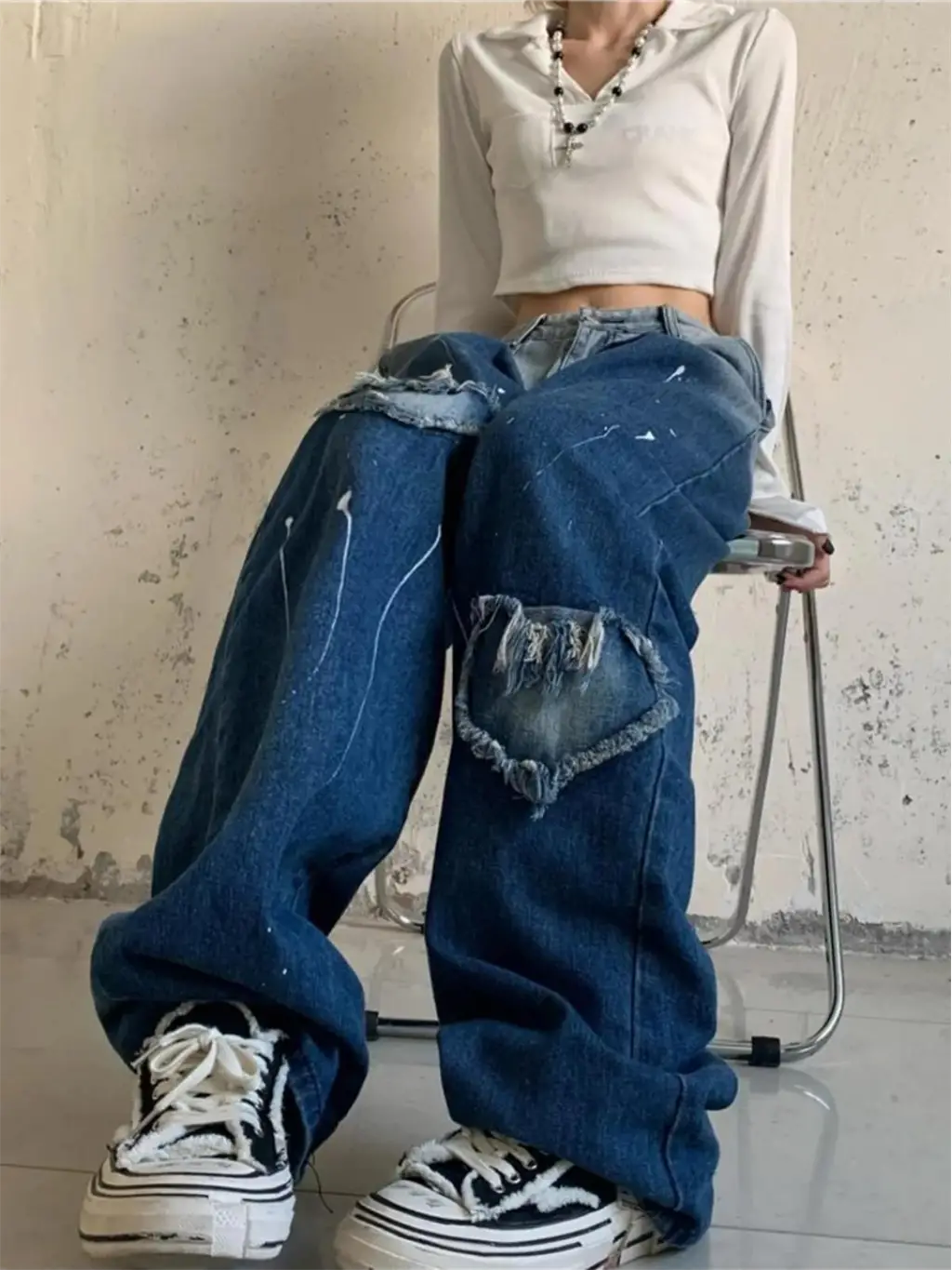 Y2k Heart Detail Streetwear Baggy Jean, 2000'lerin eğlenceli ve cesur modasını günümüze taşıyan bir parça. Bu pantolon, yüksek kaliteli pamuk ve elastan karışımıyla üretilmiştir, böylece hem rahatlık hem de esneklik sunar. Geniş paçaları ve yüksek bel kesimi ile retro bir hava yaratan pantolon, yıldız desenli yama detayları ve kar yıkama efektiyle dikkat çekici bir görünüm sunar.