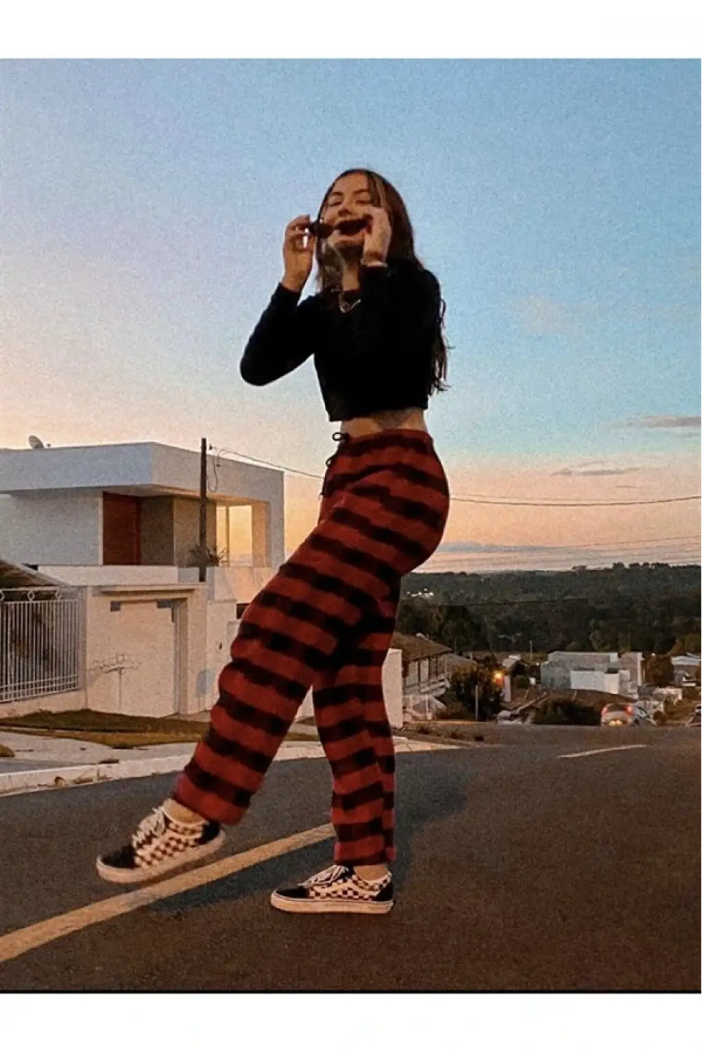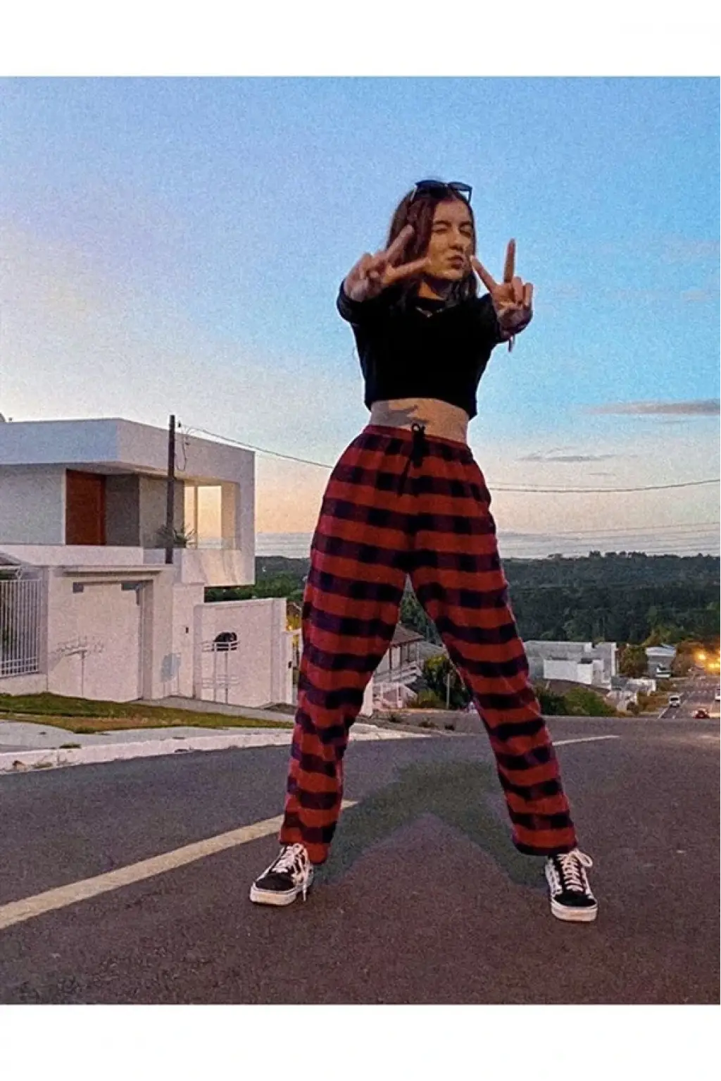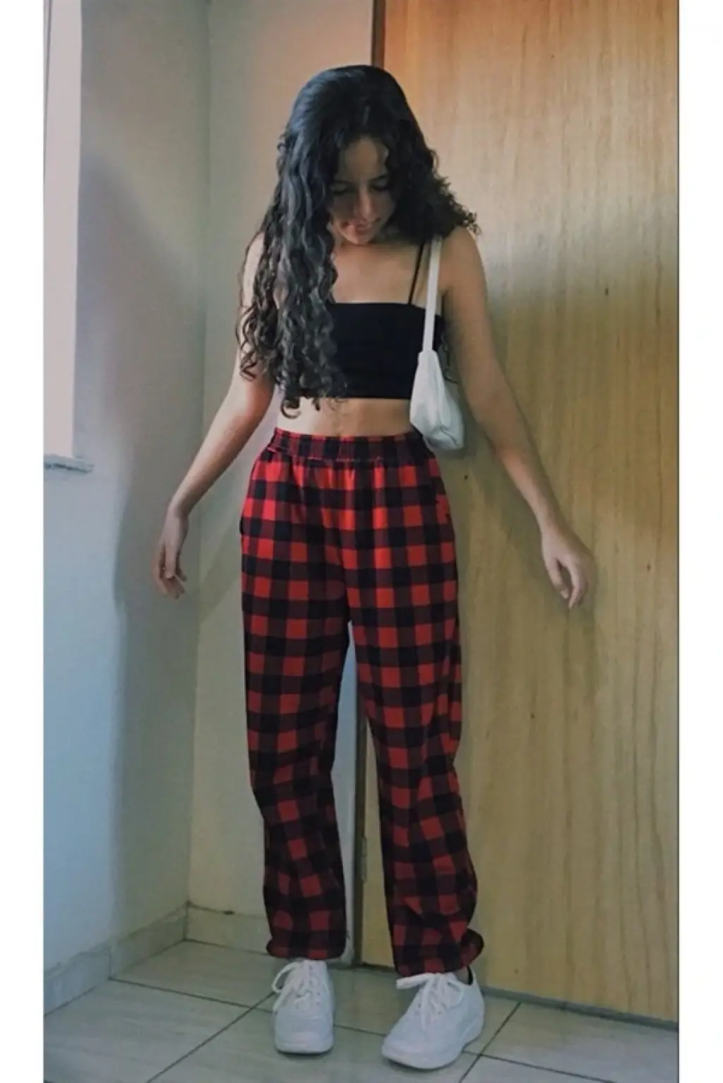 Y2K UNİSEX BELİ LASTİKLİ SİYAH KIRMIZI EKOSE PANTOLON